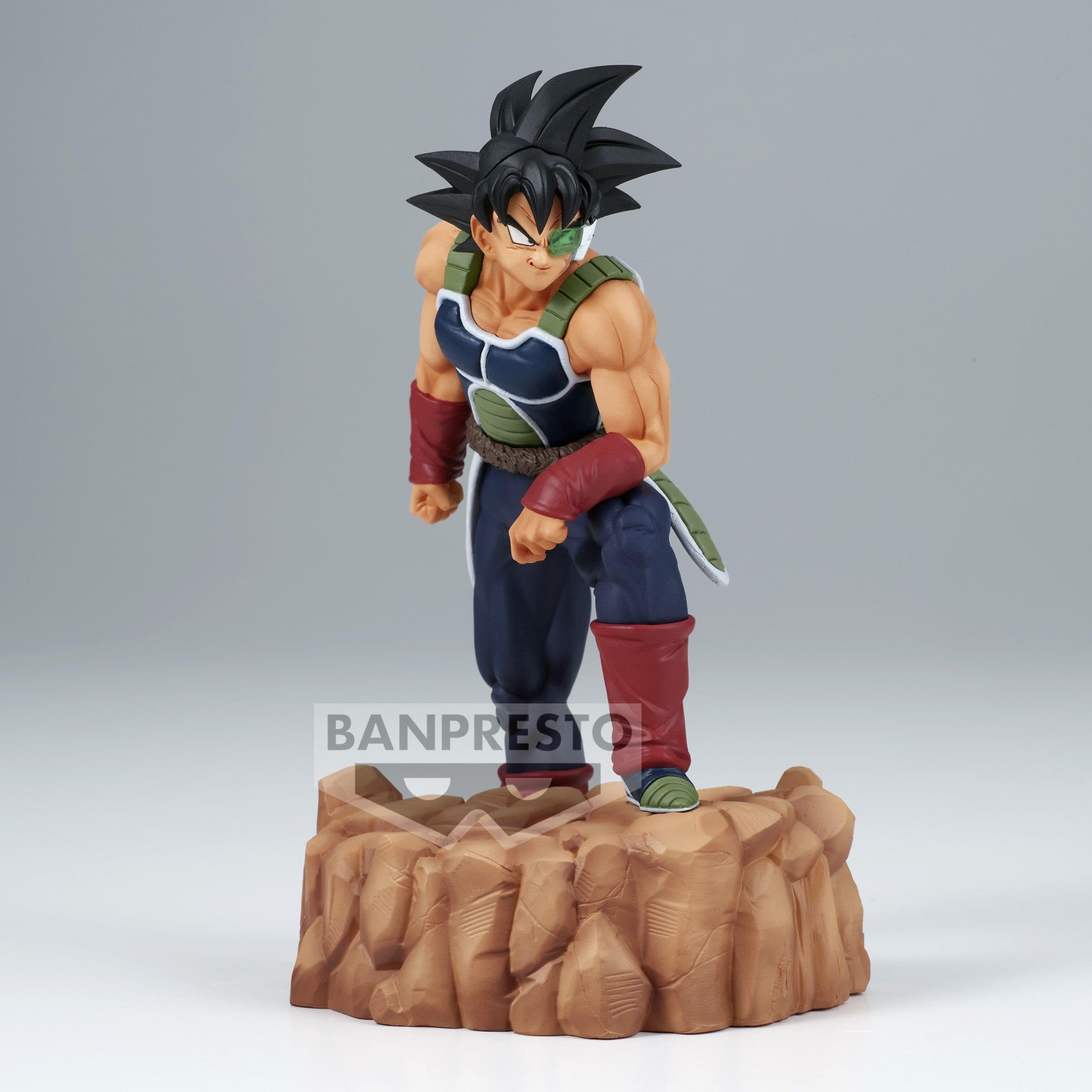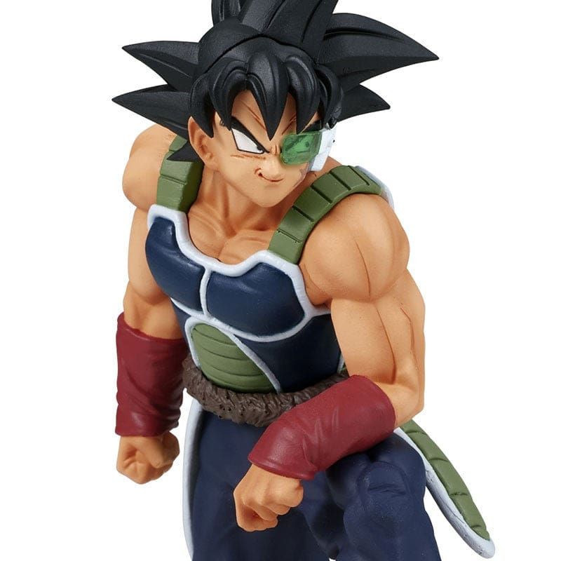 Sur cette figurine Bardock de la série History Box, le Saiyan porte son armure de combat noire et verte sans épaulettes, ainsi qu’un scouter vert qui lui permet de détecter le Ki des êtres vivants autour de lui.
