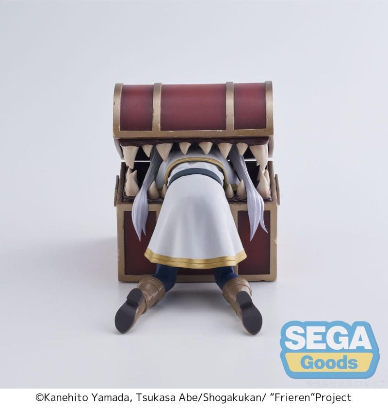 Plongez dans l’univers enchanteur de Frieren : Beyond Journey’s End avec cette adorable figurine de l’elfe Frieren. Dans une scène comique, Frieren se retrouve à quatre pattes, une partie de son corps piégée dans un coffre à trésor. Le coffre, ouvert et muni de grandes dents menaçantes, tente de dévorer notre héroïne elfique préférée.