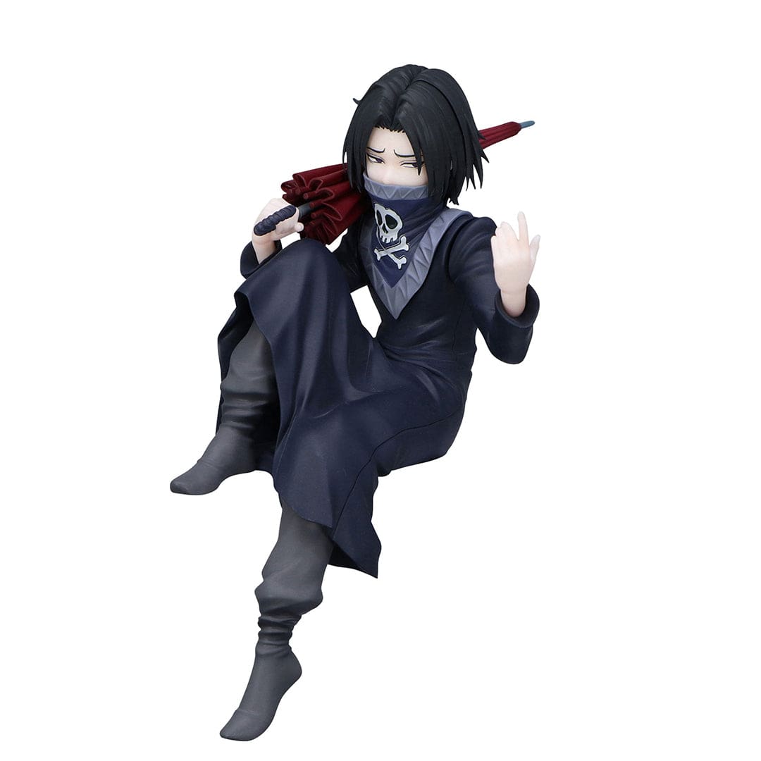 Feitan est artistiquement représenté en position assise avec une attitude sereine et détachée, tenant un parapluie sur son épaule, ajoutant une touche d’élégance et de mystère à son apparence. L’aspect énigmatique et menaçant de son visage est accentué par un masque avec un crâne ailé partiellement caché.