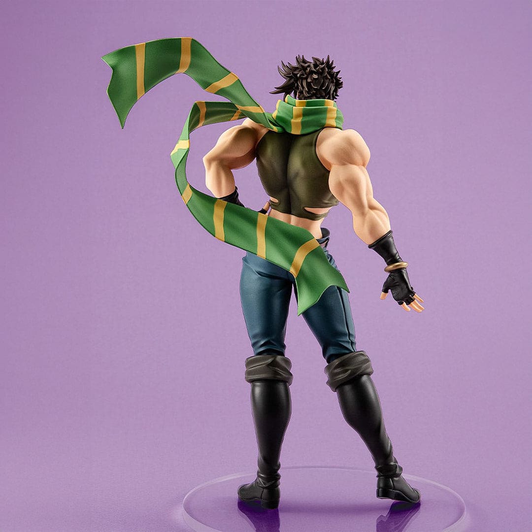 La figurine représente Joseph Joestar dans une posture résolue, avec une expression déterminée qui incarne son esprit combatif. Son costume, minimaliste mais frappant, convient parfaitement à ses diverses aventures. Il porte une brassière coupée au-dessus du nombril, des gants cloutés, un pantalon avec une ceinture en cuir, et des bottes de cuir montant aux genoux. Un long foulard rayé flottant ajoute un dynamisme distinct à son look emblématique.