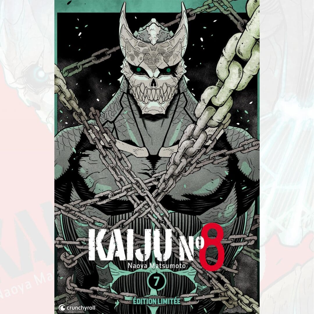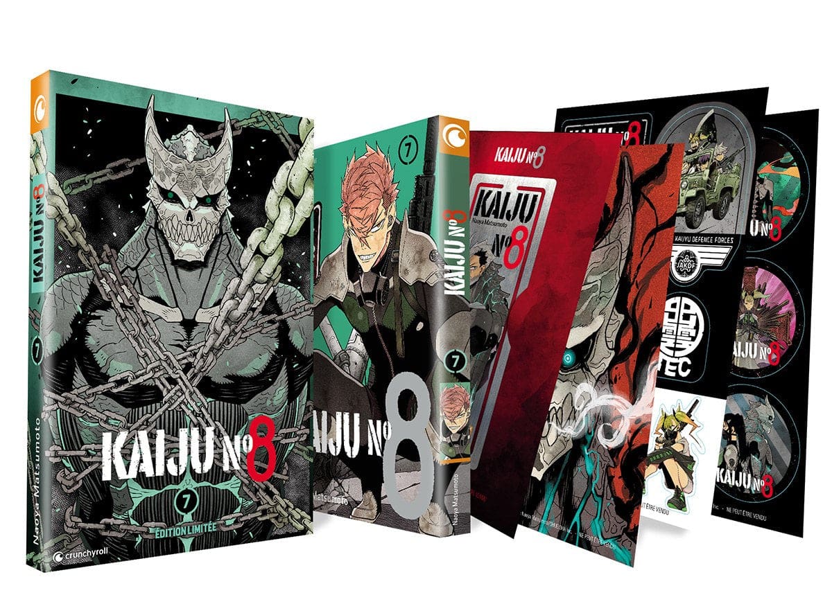 Ce Tome 07 Kaiju n°8 Édition Limitée comprend dans un coffret cartonné le Tome 7 du manga, un marque-page en métal, un ex-libris Kaiju n°8, et deux planches d’autocollants.