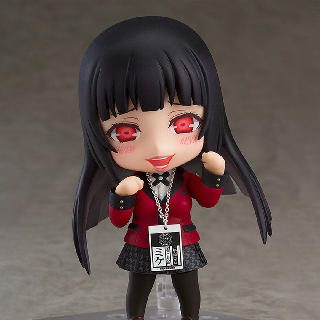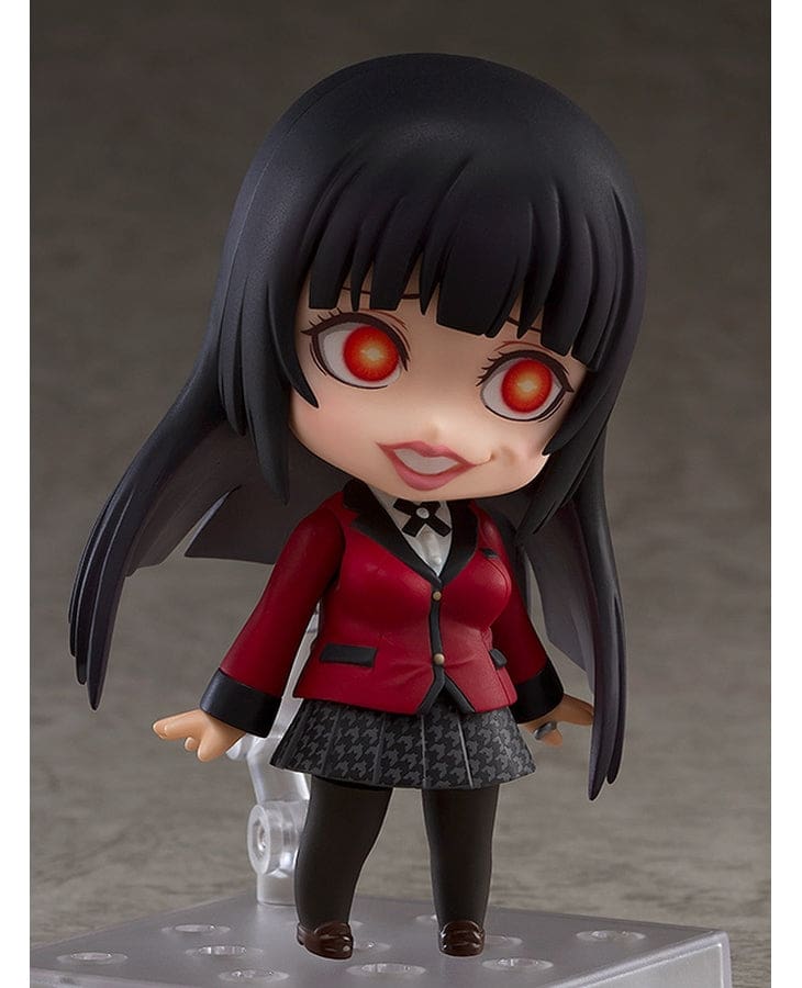 La figurine Nendoroid de Yumeko Jabami propose trois expressions faciales interchangeables : une expression neutre, une expression euphorique typique de ses jeux, et une expression intense et menaçante pour les moments de tension.