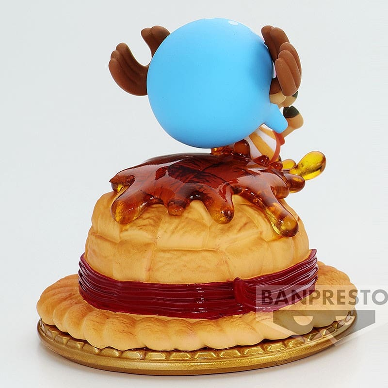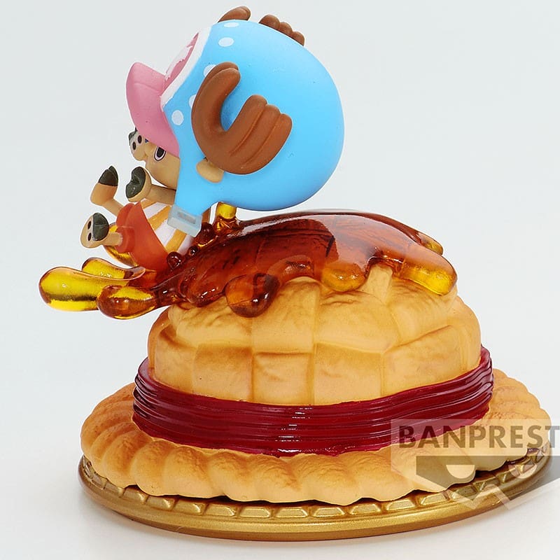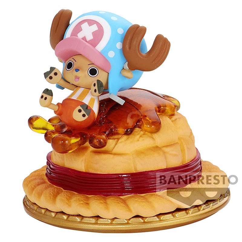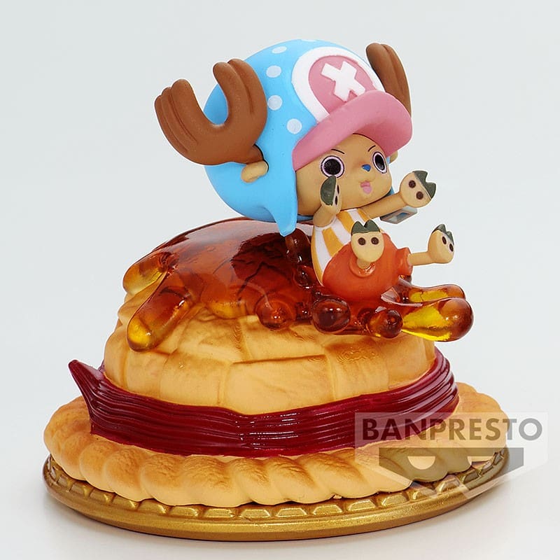 Dans cette version, Tony Tony Chopper, le médecin emblématique de l’Équipage du Chapeau de Paille, est joliment illustré dans une scène gourmande. Il glisse joyeusement sur le Chapeau de Paille de Luffy, transformé en une appétissante pâtisserie. Le caramel coulant ajoute un côté gourmand, et le tout est placé sur une assiette, accentuant l’aspect sucré de la figurine.